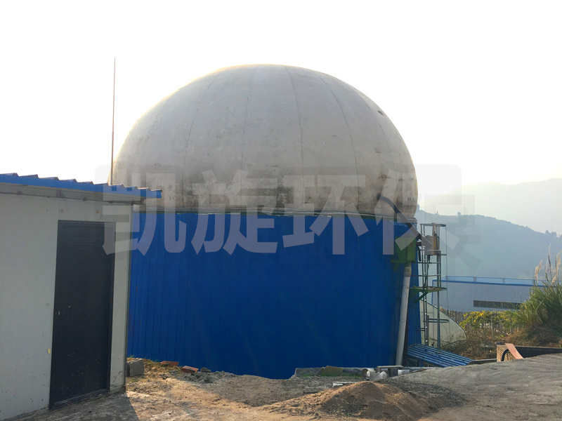 雙層膜沼氣罐外型為3/4球體,由鋼軌固定于水泥基座或厭氧罐罐頂上。主體由特殊加工聚酯材質制成,罐體由外膜、內膜、底膜(地上柜)及附屬設備組成,具有抗紫外線及種微生物的能力,高度防火并符合標準。